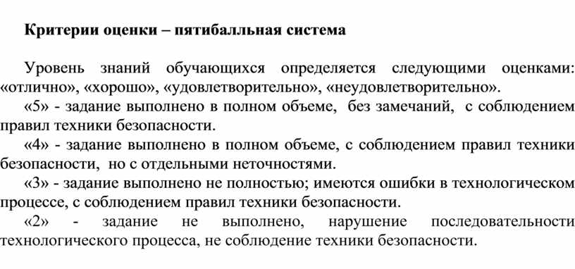 «5» - задание выполнено в полном объеме, без замечаний, с соблюдением правил техники безопасности.