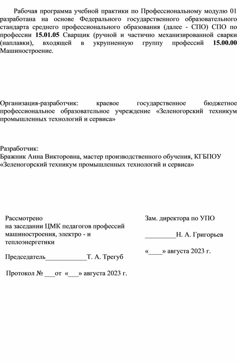 Рабочая программа учебной практики по Профессиональному модулю 01 разработана на основе Федерального государственного образовательного стандарта среднего профессионального образования (далее - СПО) СПО по профессии 15.01.05 Сварщик (ручной и частично механизированной сварки (наплавки), входящей в укрупненную группу профессий 15.00.00 Машиностроение.