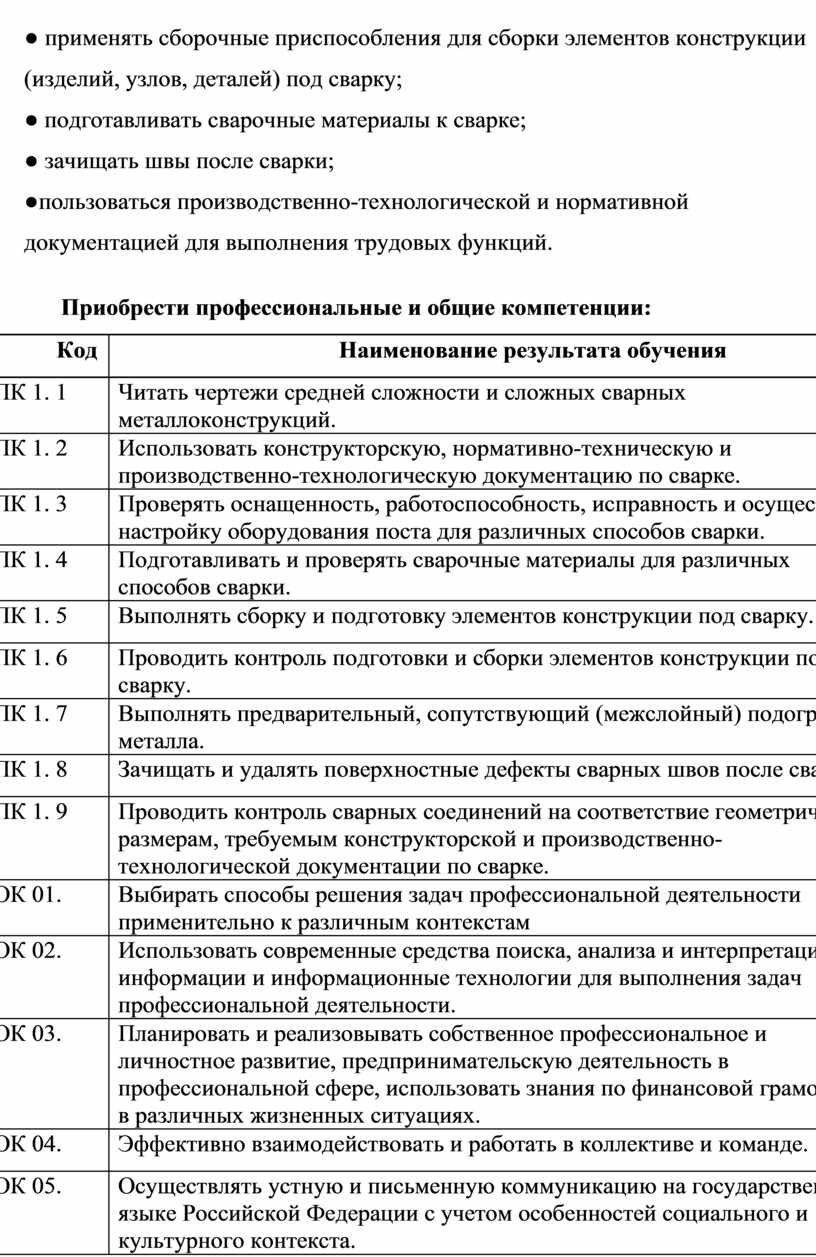 ПК 1.1. Читать чертежи средней сложности и сложных сварных металлоконструкций. ПК 1.2. Использовать конструкторскую, нормативно-техническую и производственно-технологическую документацию по сварке. ПК 1.3. Проверять оснащенность, работоспособность, исправность и осуществлять настройку оборудования поста для различных способов сварки. ПК 1.4. Подготавливать и проверять сварочные материалы для различных способов сварки. ПК 1.5. Выполнять сборку и подготовку элементов конструкции под сварку. ПК 1.6. Проводить контроль подготовки и сборки элементов конструкции под сварку. ПК 1.7. Выполнять предварительный, сопутствующий (межслойный) подогрева металла. ПК 1.8. Зачищать и удалять поверхностные дефекты сварных швов после сварки.