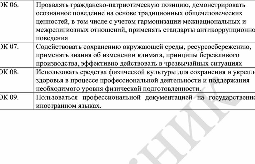 ОК 6. Проявлять гражданско-патриотическую позицию, демонстрировать осознанное поведение на основе традиционных общечеловеческих ценностей, в том числе с учетом гармонизации межнациональных и межрелигиозных отношений, применять стандарты антикоррупционного поведения. |