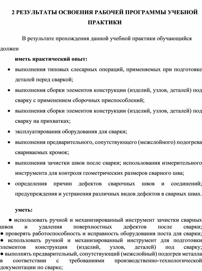 2 РЕЗУЛЬТАТЫ ОСВОЕНИЯ РАБОЧЕЙ ПРОГРАММЫ УЧЕБНОЙ ПРАКТИКИ