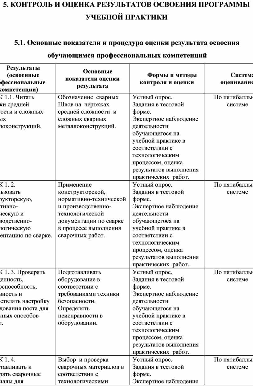 5.1. Основные показатели и процедура оценки результата освоения обучающимся профессиональных компетенций