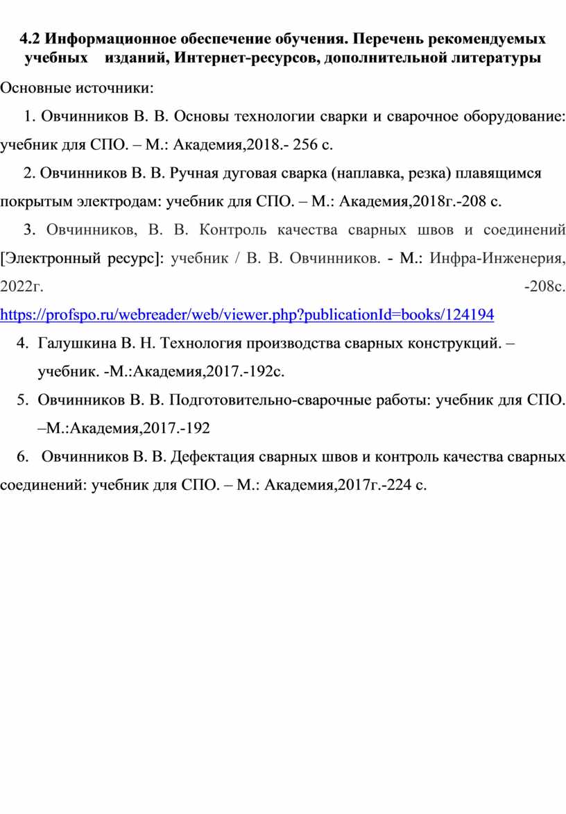 4.2 Информационное обеспечение обучения. Перечень рекомендуемых учебных изданий, Интернет-ресурсов, дополнительной литературы