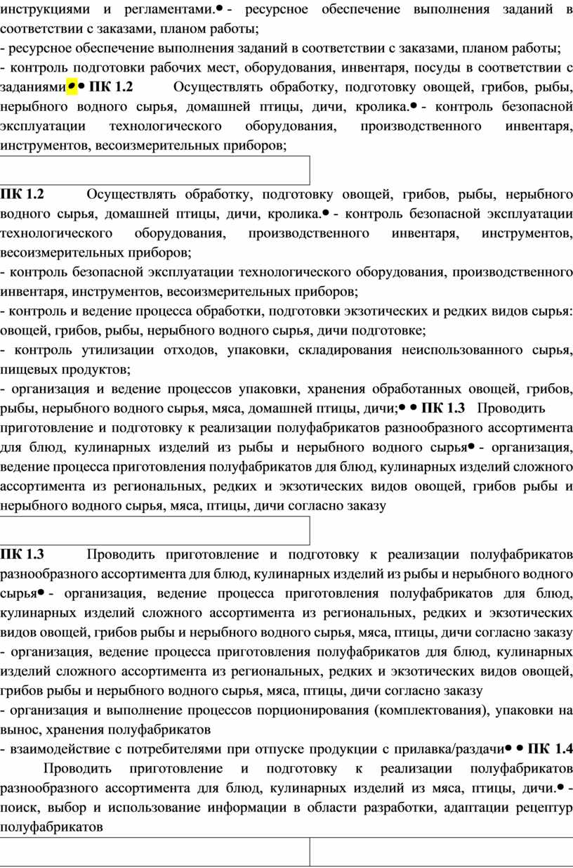 ПК 1.1. Подготавливать рабочее место, оборудование, сырье, исходные материалы для обработки сырья, приготовления полуфабрикатов в соответствии с инструкциями и регламентами. |