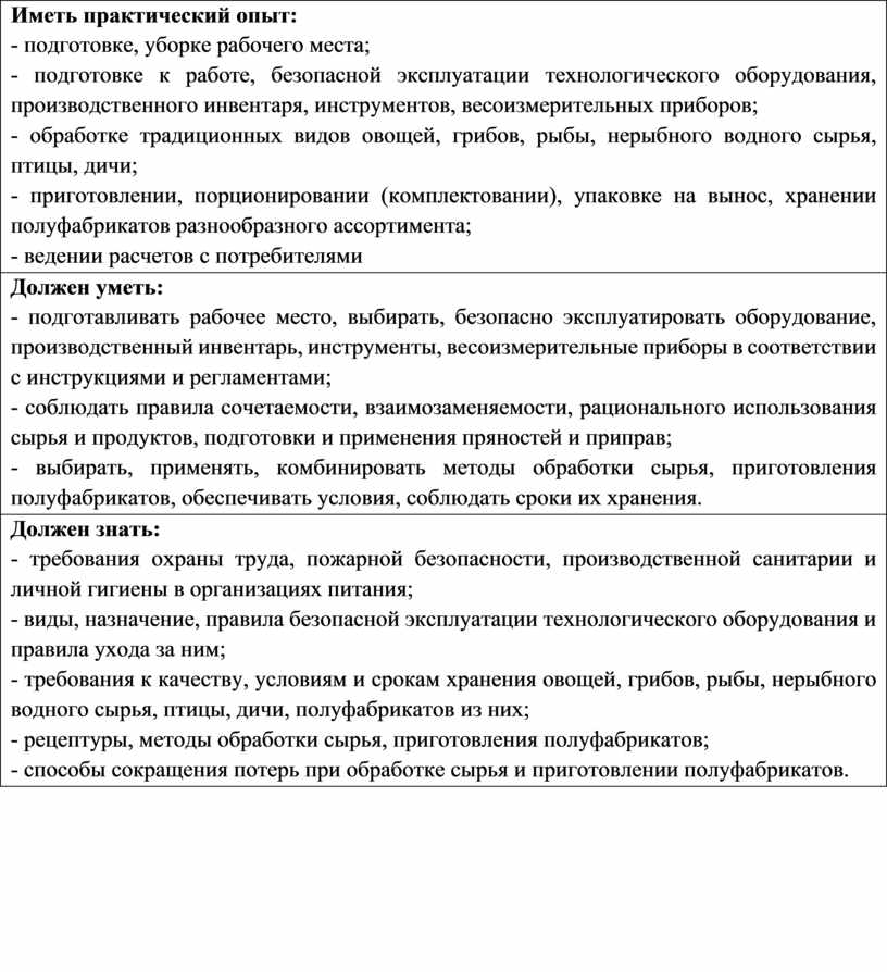 Иметь практический опыт: - подготовке, уборке рабочего места; - подготовке к работе, безопасной эксплуатации технологического оборудования, производственного инвентаря, инструментов, весоизмерительных приборов; - обработке традиционных видов овощей, грибов, рыбы, нерыбного водного сырья, птицы, дичи; - приготовлении, порционировании (комплектовании), упаковке на вынос, хранении полуфабрикатов разнообразного ассортимента; - ведении расчетов с потребителями |