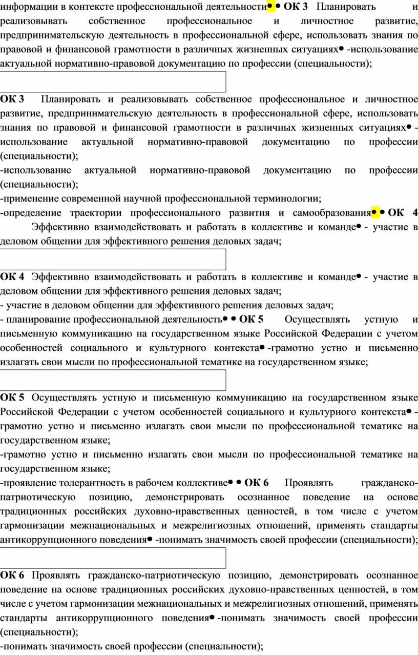 -использование актуальной нормативно-правовой документацию по профессии (специальности); -применение современной научной профессиональной терминологии; -определение траектории профессионального развития и самообразования |