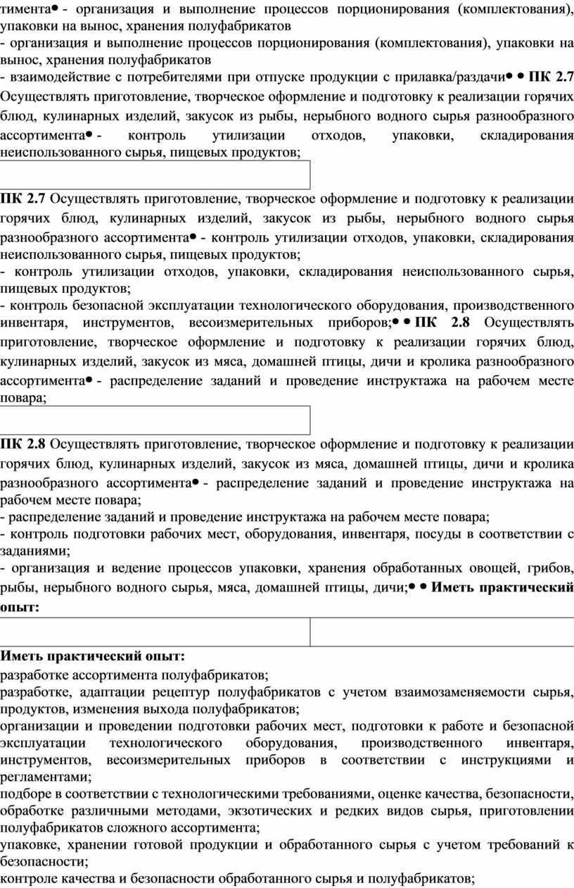 Иметь практический опыт: разработке ассортимента полуфабрикатов; разработке, адаптации рецептур полуфабрикатов с учетом взаимозаменяемости сырья, продуктов, изменения выхода полуфабрикатов; организации и проведении подготовки рабочих мест, подготовки к работе и безопасной эксплуатации технологического оборудования, производственного инвентаря, инструментов, весоизмерительных приборов в соответствии с инструкциями и регламентами; подборе в соответствии с технологическими требованиями, оценке качества, безопасности, обработке различными методами, экзотических и редких видов сырья, приготовлении полуфабрикатов сложного ассортимента; упаковке, хранении готовой продукции и обработанного сырья с учетом требований к безопасности; контроле качества и безопасности обработанного сырья и полуфабрикатов; контроле хранения и расхода продуктов. |