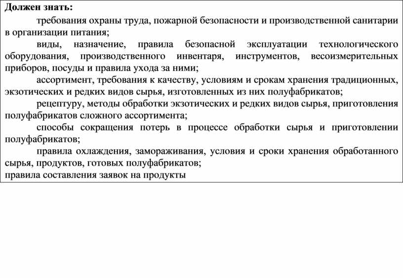 Должен знать: требования охраны труда, пожарной безопасности и производственной санитарии в организации питания; виды, назначение, правила безопасной эксплуатации технологического оборудования, производственного инвентаря, инструментов, весоизмерительных приборов, посуды и правила ухода за ними; ассортимент, требования к качеству, условиям и срокам хранения традиционных, экзотических и редких видов сырья, изготовленных из них полуфабрикатов; рецептуру, методы обработки экзотических и редких видов сырья, приготовления полуфабрикатов сложного ассортимента; способы сокращения потерь в процессе обработки сырья и приготовлении полуфабрикатов; правила охлаждения, замораживания, условия и сроки хранения обработанного сырья, продуктов, готовых полуфабрикатов; правила составления заявок на продукты |