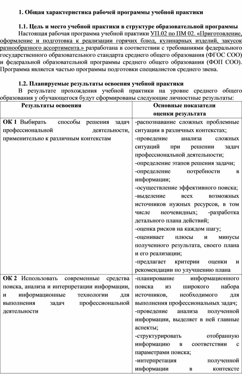 Настоящая рабочая программа учебной практики УП.02 по ПМ 02. «Приготовление, оформление и подготовка к реализации горячих блюд, кулинарных изделий, закусок разнообразного ассортимента.» разработана в соответствии с требованиями федерального государственного образовательного стандарта среднего общего образования (ФГОС СОО) и федеральной образовательной программы среднего общего образования (ФОП СОО). Программа является частью программы подготовки специалистов среднего звена.
