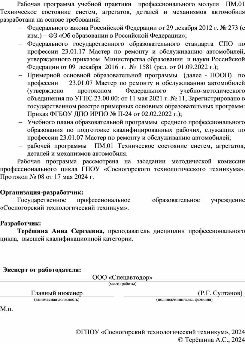Рабочая программа рассмотрена на заседании методической комиссии профессионального цикла ГПОУ «Сосногорского технологического техникума». Протокол № 08 от 17 мая 2024 г.