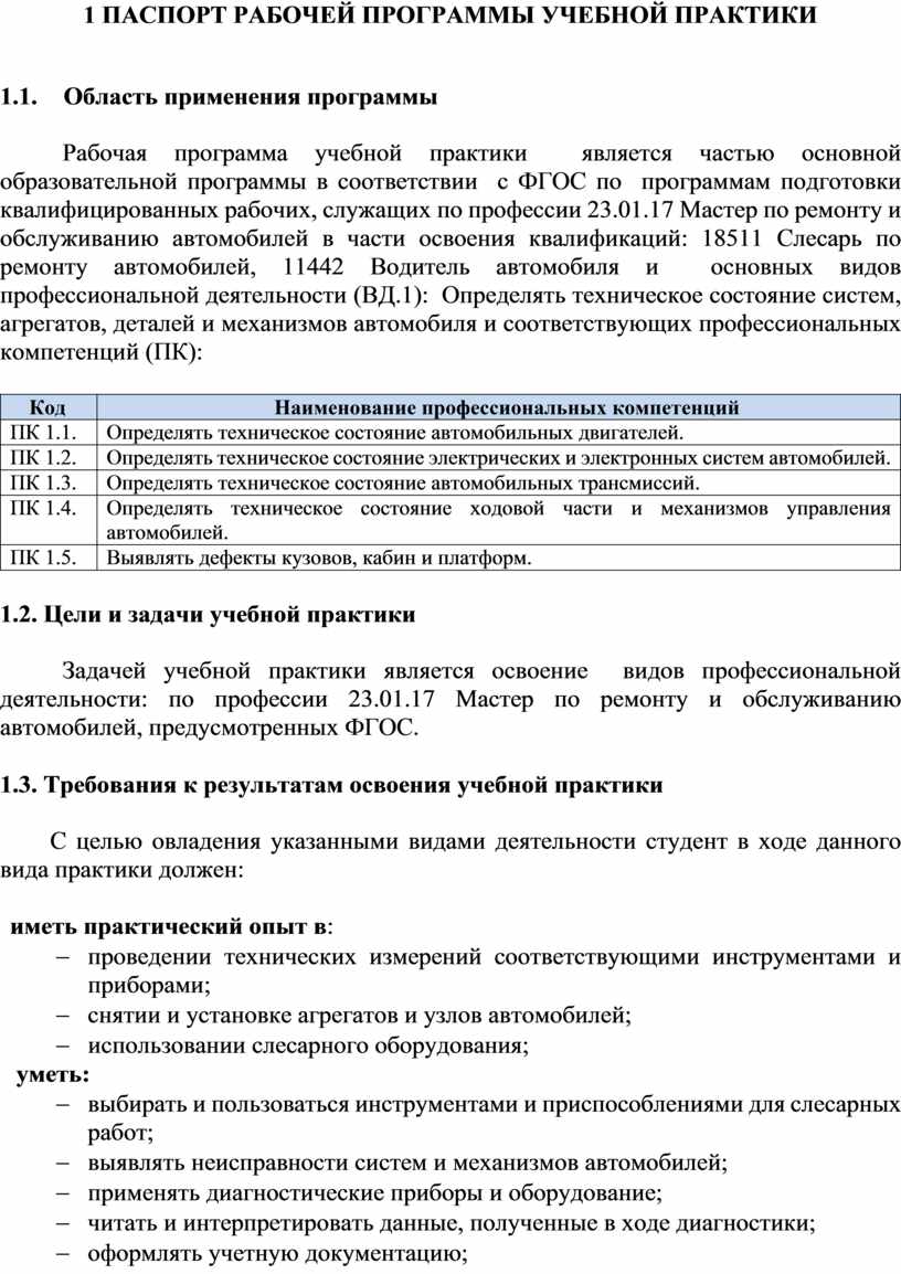 Рабочая программа учебной практики является частью основной образовательной программы в соответствии с ФГОС по программам подготовки квалифицированных рабочих, служащих по профессии 23.01.17 Мастер по ремонту и обслуживанию автомобилей в части освоения квалификаций: 18511 Слесарь по ремонту автомобилей, 11442 Водитель автомобиля и основных видов профессиональной деятельности (ВД.1): Определять техническое состояние систем, агрегатов, деталей и механизмов автомобиля и соответствующих профессиональных компетенций (ПК):