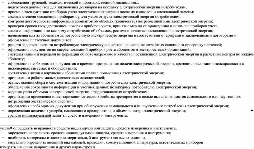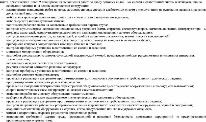 − планирования выполнения работ по вводу домовых силовых систем и слаботочных систем в эксплуатацию на основании задания и на основе должностной инструкции; − выбора электроизмерительных инструментов в соответствии с полученным заданием; − выбора средств индивидуальной защиты; − подготовки рабочего места на соответствие требованиям охраны труда; − контроля мультиметром напряжения подключенных устройств (ламп, стартеров, светорегуляторов, датчиков движения, фоторегуляторов, домовых указателей, маршрутизаторов, датчиков сигнализации, оповещения и другого оборудования); − контроля подключения розеток, выключателей, устройств защитного отключения, автоматических выключателей; − контроля мультиметром напряжения в электрощите домового ввода на вводных и выводных кабелях; − приборного контроля сопротивления изоляции кабелей и проводов; − контроля приборных установок в соответствии со схемой и заданием; − монтажа и модернизации оборудования; − настройки специальных установок со сложной электрической схемой, предназначенной для регулирования и испытания аппаратуры телеавтоматики; − испытания и наладки цепей схем телеавтоматики; − ремонта и наладки контактно-релейной аппаратуры; − контроля приборных установок в соответствии со схемой и заданием; − настройки сетевого маршрутизатора; − проверки и реализации алгоритмов программирования контроллеров в соответствии с требованиями технического задания; − программирования логических реле и контроллеров; − проведения измерений электрических характеристик обслуживаемого диспетчерского оборудования и аппаратуры телеавтоматики; − сборки испытательных схем для проверки и наладки схем телеавтоматики; − выполнения работ по монтажу оборудования телеавтоматики; − разборки и сборки, а также механического и электрического регулирование оборудования; − проверки и реализации алгоритмов программирования в соответствии с требованиями технического задания; − контроля исправности рабочего и резервного освещения закрепленного электротехнического оборудования, зданий и сооружений; − аварийного отключение оборудования в случаях, когда оборудованию или людям угрожает опасность; − записи в оперативном журнале результатов проведенных работ; − выполнения требований охраны труда, промышленной и пожарной безопасности, проведения мероприятий по предупреждению производственного травматизма; − соблюдения трудовой, технологической и производственной дисциплины; − подготовки документов для заключения договоров на поставку электрической энергии потребителям; − приема в эксплуатацию приборов учета электрической энергии после их плановой и внеплановой замены; − анализа степени оснащения приборами учета узлов отпуска электрической энергии потребителям; − контроля достоверности информации абонентов об объемах (количестве) потребленной ими электрической энергии; − проверки сроков государственной поверки приборов учета, принятие мер по ее проведению или замене приборов учета; − анализа информации по каждому потребителю об объемах, режиме и качестве поставленной электрической энергии; − начисления платы абонентам за потребленную электрическую энергию в соответствии с тарифами и заключенными договорами и оформление платежных документов; − расчета за