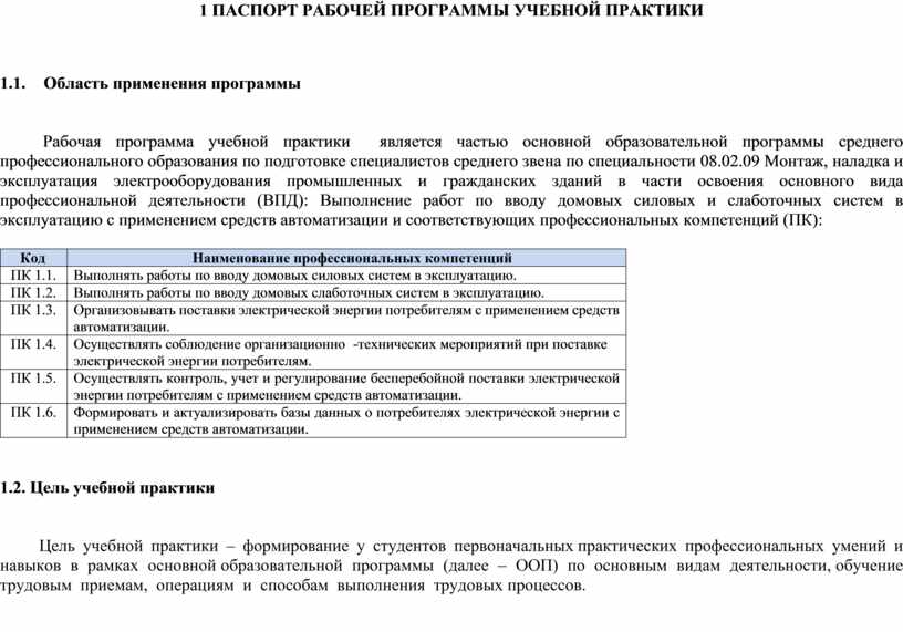 Рабочая программа учебной практики является частью основной образовательной программы среднего профессионального образования по подготовке специалистов среднего звена по специальности 08.02.09 Монтаж, наладка и эксплуатация электрооборудования промышленных и гражданских зданий в части освоения основного вида профессиональной деятельности (ВПД): Выполнение работ по вводу домовых силовых и слаботочных систем в эксплуатацию с применением средств автоматизации и соответствующих профессиональных компетенций (ПК):