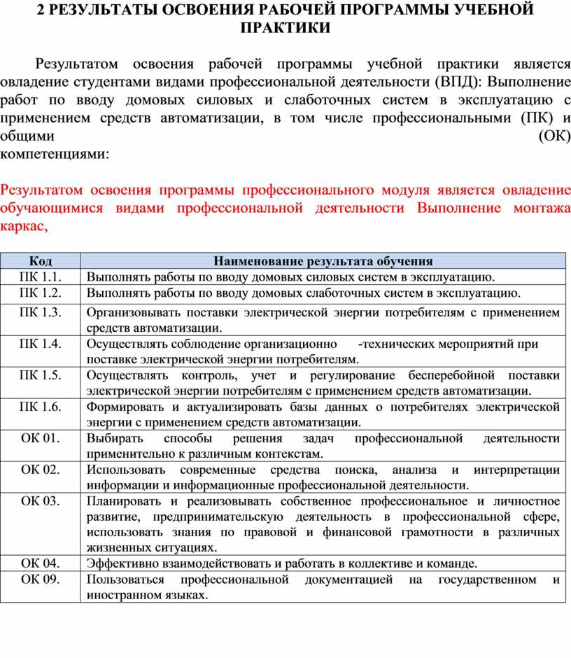 Результатом освоения рабочей программы учебной практики является овладение студентами видами профессиональной деятельности (ВПД): Выполнение работ по вводу домовых силовых и слаботочных систем в эксплуатацию с применением средств автоматизации, в том числе профессиональными (ПК) и общими (ОК) компетенциями: Результатом освоения программы профессионального модуля является овладение обучающимися видами профессиональной деятельности Выполнение монтажа каркас,