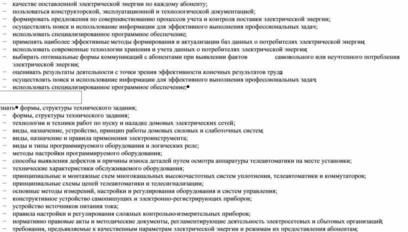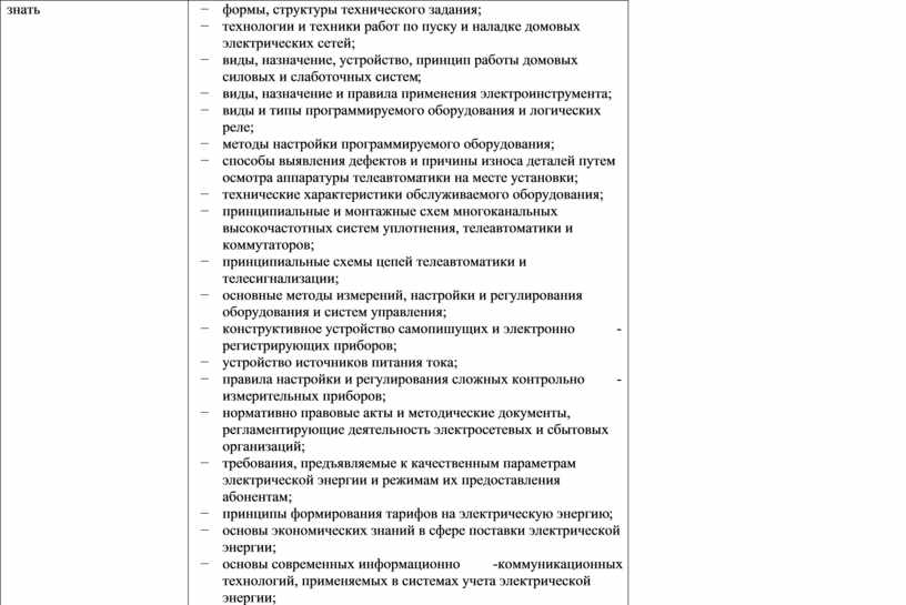 − формы, структуры технического задания; − технологии и техники работ по пуску и наладке домовых электрических сетей; − виды, назначение, устройство, принцип работы домовых силовых и слаботочных систем; − виды, назначение и правила применения электроинструмента; − виды и типы программируемого оборудования и логических реле; − методы настройки программируемого оборудования; − способы выявления дефектов и причины износа деталей путем осмотра аппаратуры телеавтоматики на месте установки; − технические характеристики обслуживаемого оборудования; − принципиальные и монтажные схем многоканальных высокочастотных систем уплотнения, телеавтоматики и коммутаторов; − принципиальные схемы цепей телеавтоматики и телесигнализации; − основные методы измерений, настройки и регулирования оборудования и систем управления; − конструктивное устройство самопишущих и электронно-регистрирующих приборов; − устройство источников питания тока; − правила настройки и регулирования сложных контрольно-измерительных приборов; − нормативно правовые акты и методические документы, регламентирующие деятельность электросетевых и сбытовых организаций; − требования, предъявляемые к качественным параметрам электрической энергии и режимам их предоставления абонентам; − принципы формирования тарифов на электрическую энергию; − основы экономических знаний в сфере поставки электрической энергии; − основы современных информационно-коммуникационных технологий, применяемых в системах учета электрической энергии; − требования охраны труда и пожарной безопасности; − порядок работы с электроизмерительными приборами − основные технические характеристики систем и приборов учета электрической энергии; − номенклатуру и правила эксплуатации систем и приборов учета электрической энергии. |