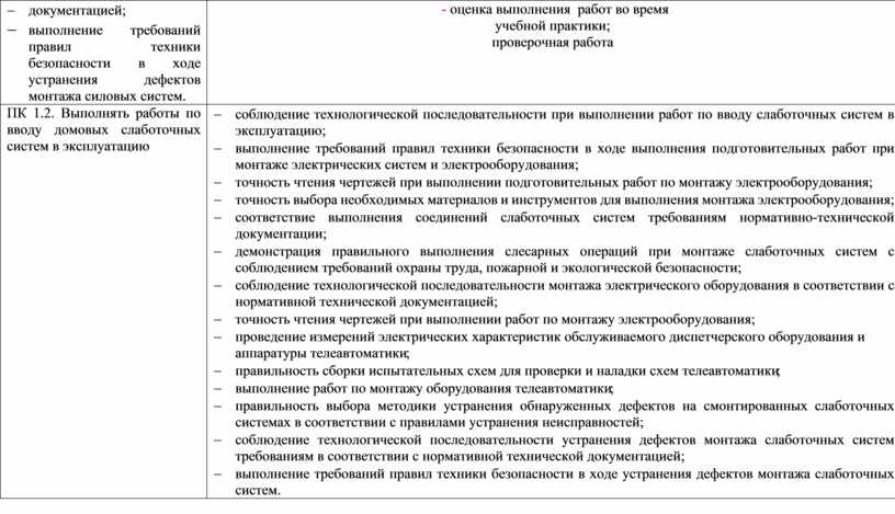 - соблюдение технологической последовательности при выполнении работ по вводу слаботочных систем в эксплуатацию; - выполнение требований правил техники безопасности в ходе выполнения подготовительных работ при монтаже электрических систем и электрооборудования; - точность чтения чертежей при выполнении подготовительных работ по монтажу электрооборудования; - точность выбора необходимых материалов и инструментов для выполнения монтажа электрооборудования; - соответствие выполнения соединений слаботочных систем требованиям нормативно-технической документации; - демонстрация правильного выполнения слесарных операций при монтаже слаботочных систем с соблюдением требований охраны труда, пожарной и экологической безопасности; - соблюдение технологической последовательности монтажа электрического оборудования в соответствии с нормативной технической документацией; - точность чтения чертежей при выполнении работ по монтажу электрооборудования; - проведение измерений электрических характеристик обслуживаемого диспетчерского оборудования и аппаратуры телеавтоматики; - правильность сборки испытательных схем для проверки и наладки схем телеавтоматики; - выполнение работ по монтажу оборудования телеавтоматики; - правильность выбора методики устранения обнаруженных дефектов на смонтированных слаботочных системах в соответствии с правилами устранения неисправностей; - соблюдение технологической последовательности устранения дефектов монтажа слаботочных систем требованиям в соответствии с нормативной технической документацией; - выполнение требований правил техники безопасности в ходе устранения дефектов монтажа слаботочных систем. |