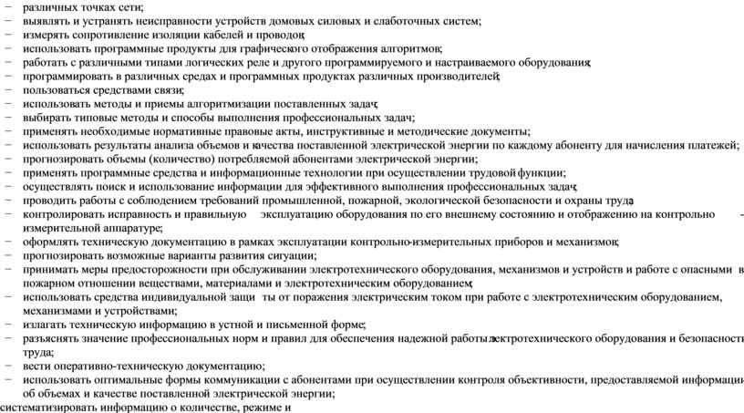 − определять исправность средств индивидуальной защиты, средств измерения и инструмента; − подбирать материалы и электроизмерительный инструмент согласно заданию; − визуально определять внешний вид кабелей, проводки, коммутационной аппаратуры, осветительных приборов; − измерять значения напряжения и других параметров в различных точках сети; − выявлять и устранять неисправности устройств домовых силовых и слаботочных систем; − измерять сопротивление изоляции кабелей и проводов; − использовать программные продукты для графического отображения алгоритмов; − работать с различными типами логических реле и другого программируемого и настраиваемого оборудования; − программировать в различных средах и программных продуктах различных производителей; − пользоваться средствами связи; − использовать методы и приемы алгоритмизации поставленных задач; − выбирать типовые методы и способы выполнения профессиональных задач; − применять необходимые нормативные правовые акты, инструктивные и методические документы; − использовать результаты анализа объемов и качества поставленной электрической энергии по каждому абоненту для начисления платежей; − прогнозировать объемы (количество) потребляемой абонентами электрической энергии; − применять программные средства и информационные технологии при осуществлении трудовой функции; − осуществлять поиск и использование информации для эффективного выполнения профессиональных задач; − проводить работы с соблюдением требований промышленной, пожарной, экологической безопасности и охраны труда; − контролировать исправность и правильную эксплуатацию оборудования по его внешнему состоянию и отображению на контрольно-измерительной аппаратуре; − оформлять техническую документацию в рамках эксплуатации контрольно-измерительных приборов и механизмов; − прогнозировать возможные варианты развития ситуации; − принимать меры предосторожности при обслуживании электротехнического оборудования, механизмов и устройств и работе с опасными в пожарном отношении веществами, материалами и электротехническим оборудованием; − использовать средства индивидуальной защиты от поражения электрическим током при работе с электротехническим оборудованием, механизмами и устройствами; − излагать техническую информацию в устной и письменной форме; − разъяснять значение профессиональных норм и правил для обеспечения надежной работы электротехнического оборудования и безопасности труда; − вести оперативно-техническую документацию; − использовать оптимальные формы коммуникации с абонентами при осуществлении контроля объективности, предоставляемой информации об объемах и качестве поставленной электрической энергии; − систематизировать информацию о количестве, режиме и качестве поставленной электрической энергии по каждому абоненту; − пользоваться конструкторской, эксплуатационной и технологической документацией; − формировать предложения по совершенствованию процессов учета и контроля поставки электрической энергии; − осуществлять поиск и использование информации для эффективного выполнения профессиональных задач; − использовать специализированное программное обеспечение; − применять наиболее эффективные методы формирования и актуализации баз данны