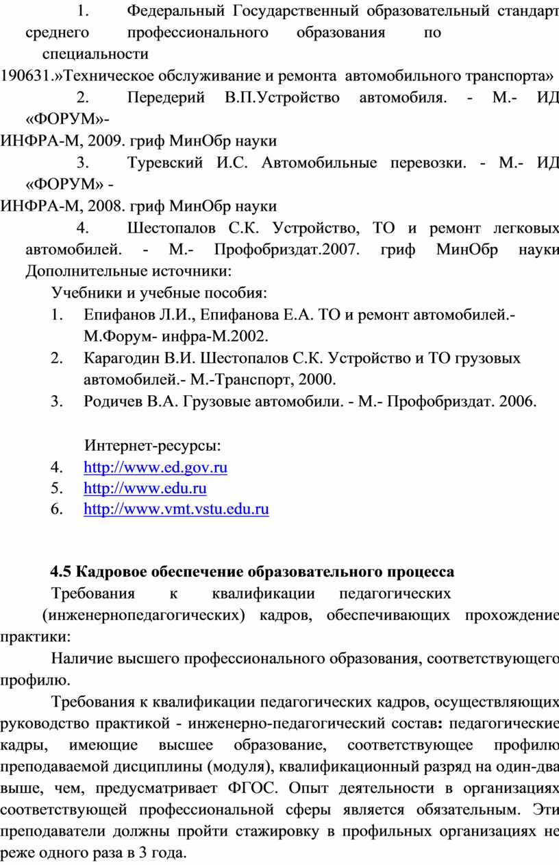 2. Федеральный государственный образовательный стандарт СПО по специальности 190631 Техническое обслуживание и ремонт автомобильного транспорта