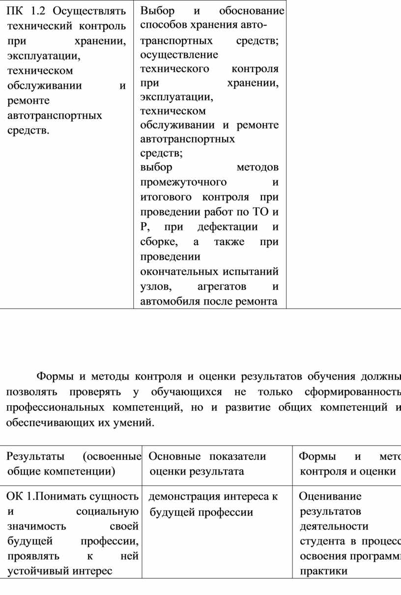 ПК 1.2 Осуществлять технический контроль при хранении, эксплуатации, техническом обслуживании и ремонте автотранспортных средств |