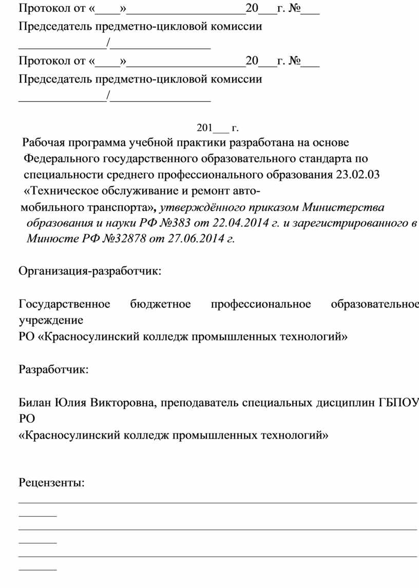 Рабочая программа учебной практики разработана на основе Федерального государственного образовательного стандарта по специальности среднего профессионального образования 23.02.03 «Техническое обслуживание и ремонт авто-