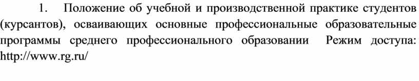 3. Положение об учебной и производственной практике студентов (курсантов), осваивающих основные профессиональные образовательные программы среднего профессионального образовании Режим доступа: http://www.rg.ru/