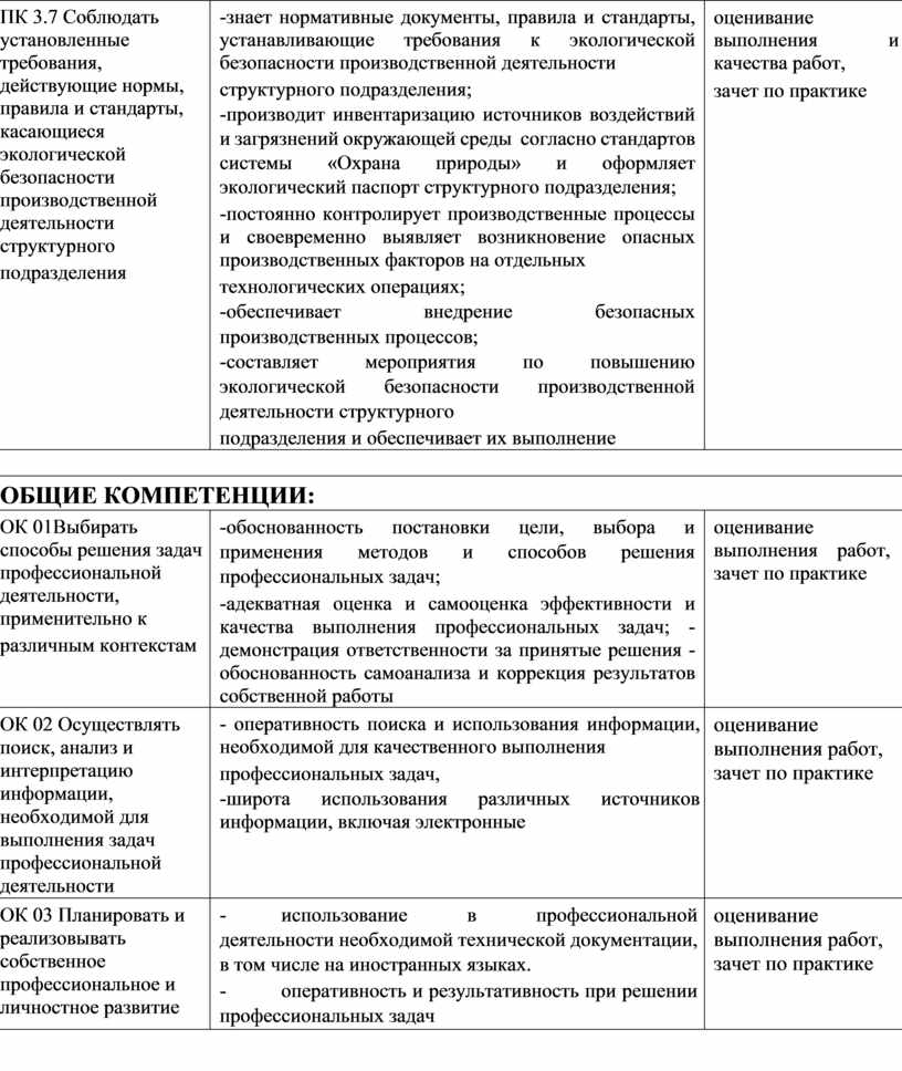 ПК 3.7 Соблюдать установленные требования, действующие нормы, правила и стандарты, касающиеся экологической безопасности производственной деятельности структурного подразделения