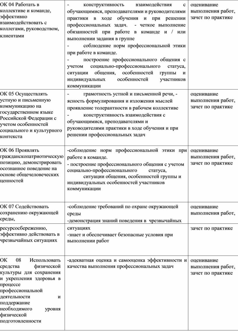 - грамотность устной и письменной речи, -ясность формулирования и изложения мыслей проявление толерантности в рабочем коллективе - конструктивность взаимодействия с обучающимися, преподавателями и руководителями практики в ходе обучения и при решении профессиональных задач |