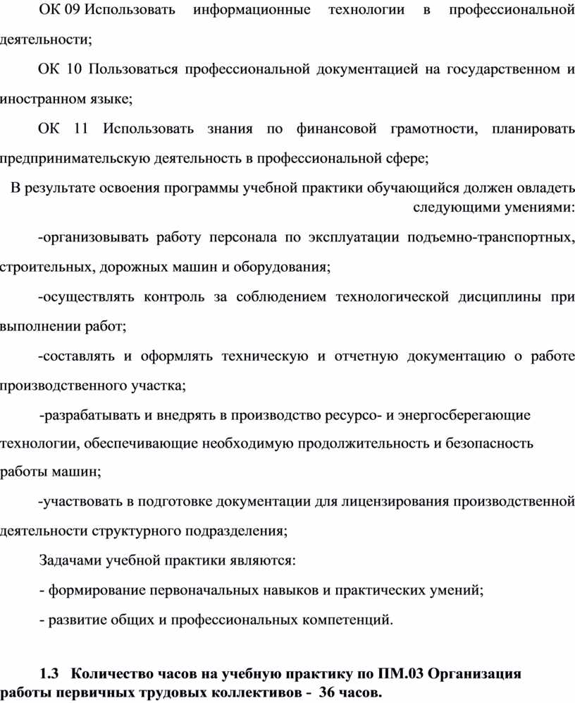 1.3 Количество часов на учебную практику по ПМ.03 Организация работы первичных трудовых коллективов - 36 часов.