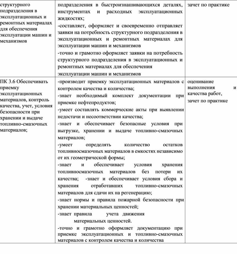 ПК 3.6 Обеспечивать приемку эксплуатационных материалов, контроль качества, учет, условия безопасности при хранении и выдаче топливно-смазочных материалов; |