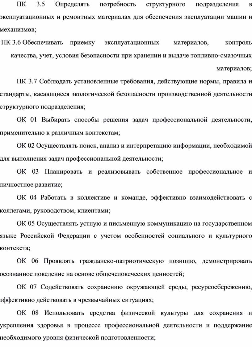 ПК 3.5 Определять потребность структурного подразделения в эксплуатационных и ремонтных материалах для обеспечения эксплуатации машин и механизмов;