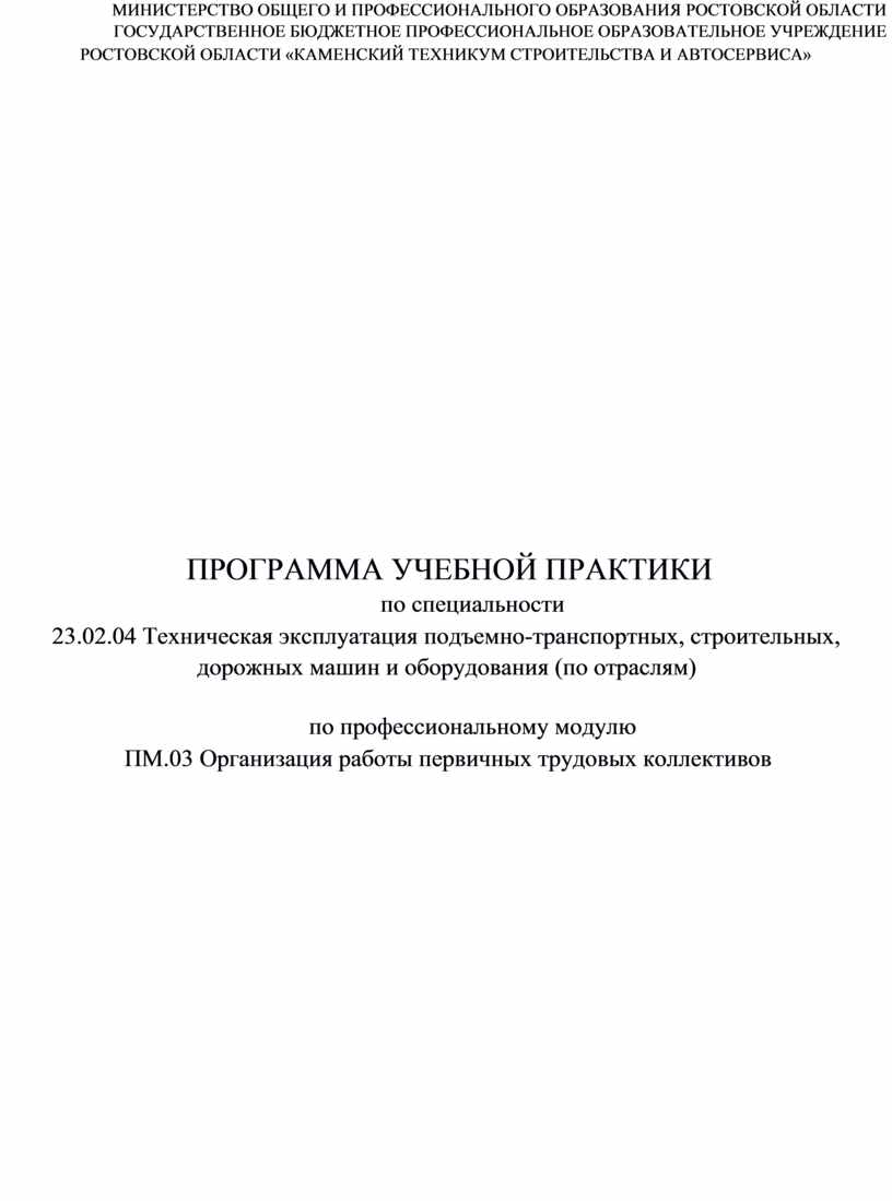 Программа учебной практики по специальности 23.02.04 Техническая эксплуатация подъемно-транспортных, строительных, дорожных машин и оборудования (по отраслям), ПМ.03 Организация работы первичных трудовых коллективов разработана на основе требований: