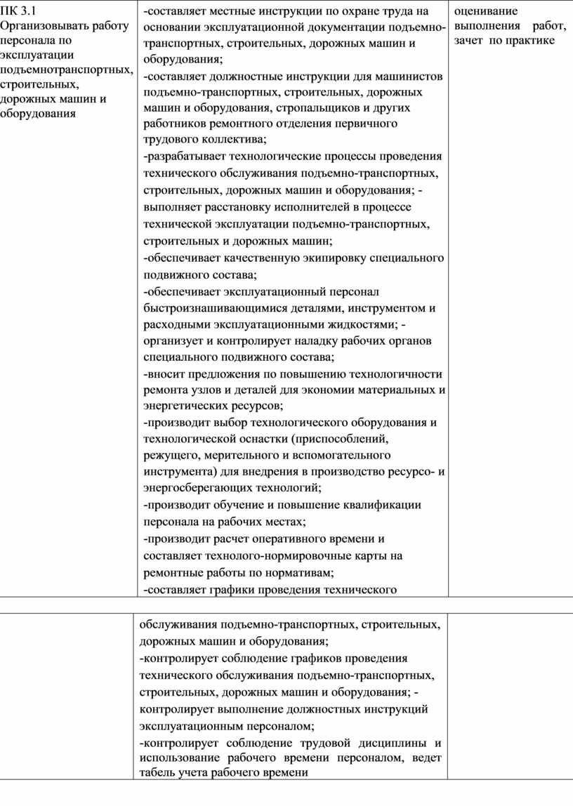 ПК 3.1 Организовывать работу персонала по эксплуатации подъемнотранспортных, строительных, дорожных машин и оборудования |