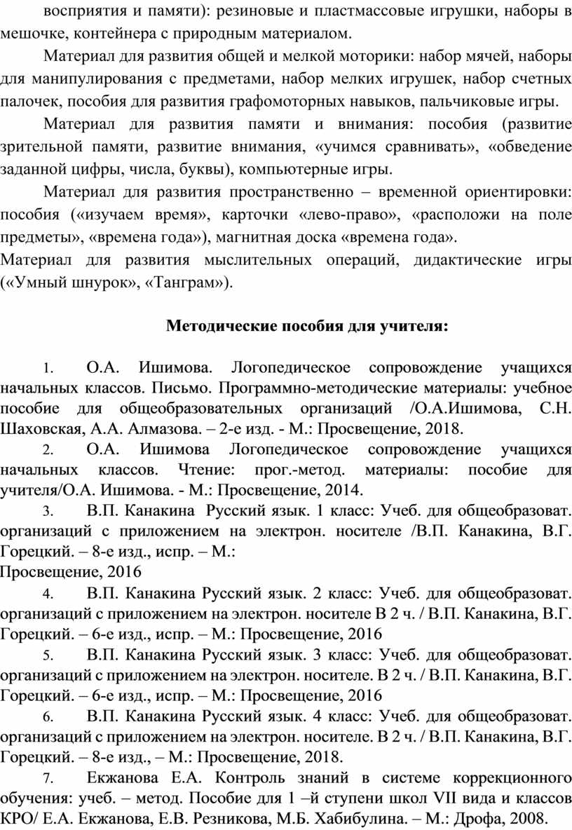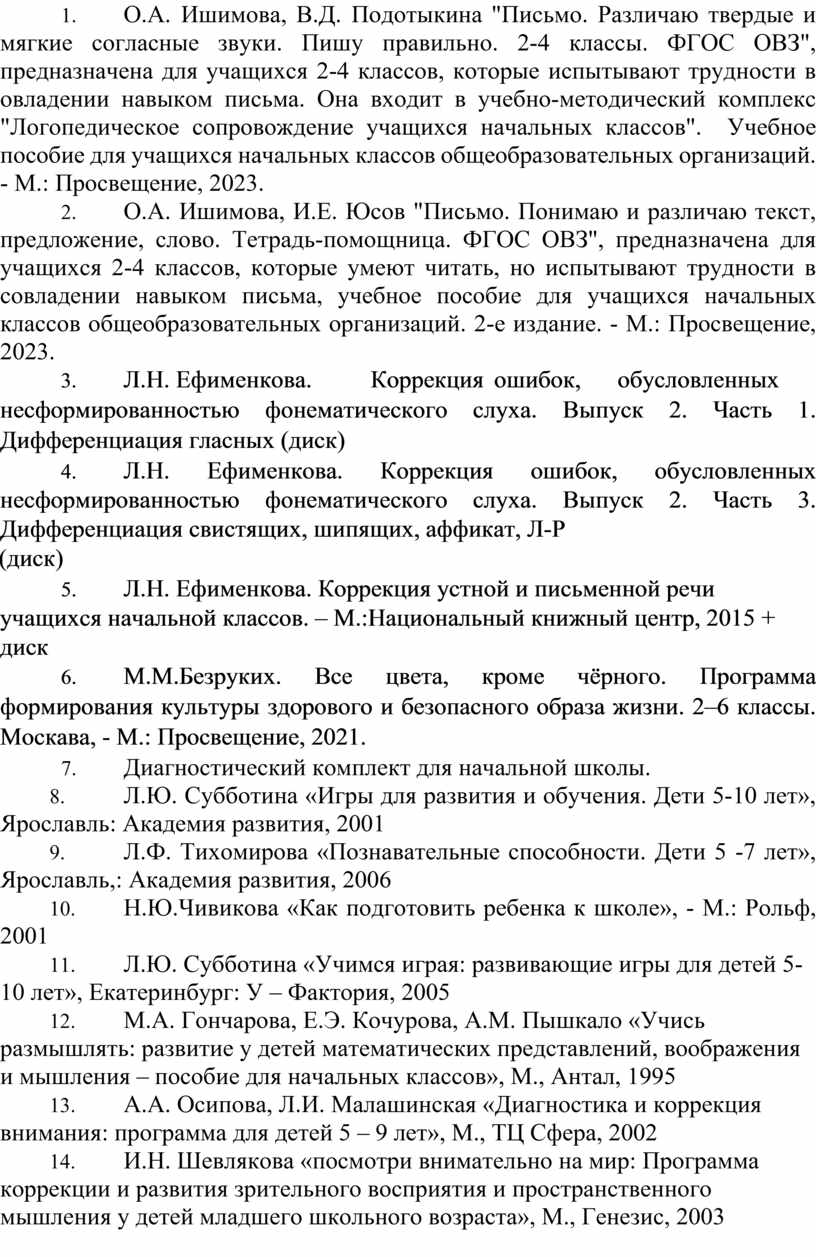 1. О.А. Ишимова. Логопедическое сопровождение учащихся начальных классов. Письмо. Программно-методические материалы: учебное пособие для общеобразовательных организаций /О.А.Ишимова, С.Н. Шаховская, А.А. Алмазова. – 2-е изд. - М.: Просвещение, 2018.