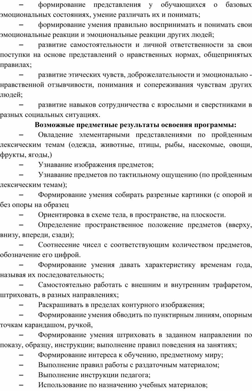 Предметных, включающих освоенный учащимися в ходе изучения учебного предмета опыт специфической для данной предметной области деятельности по получению нового знания и его применению. Результаты освоения программы рассматриваются как возможные (примерные) и соразмерные с индивидуальными возможностями и специфическими образовательными потребностями учащихся.