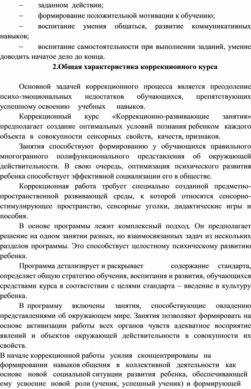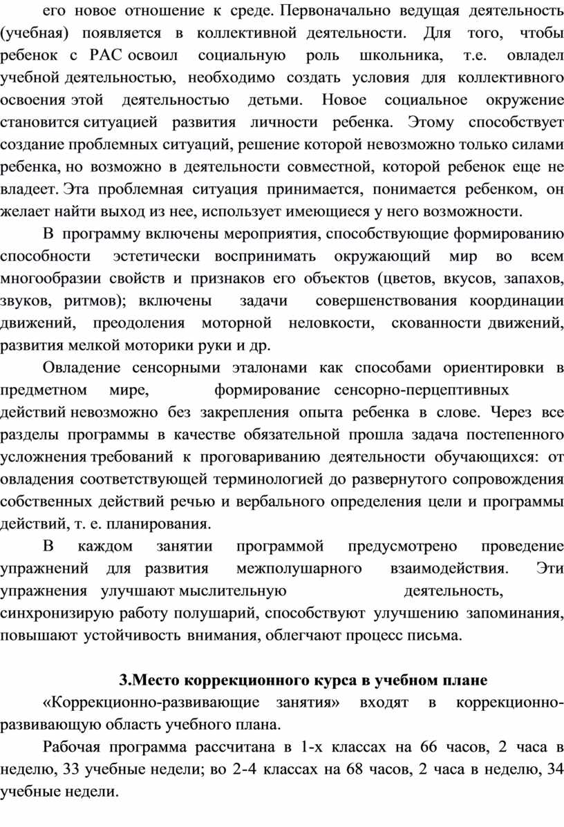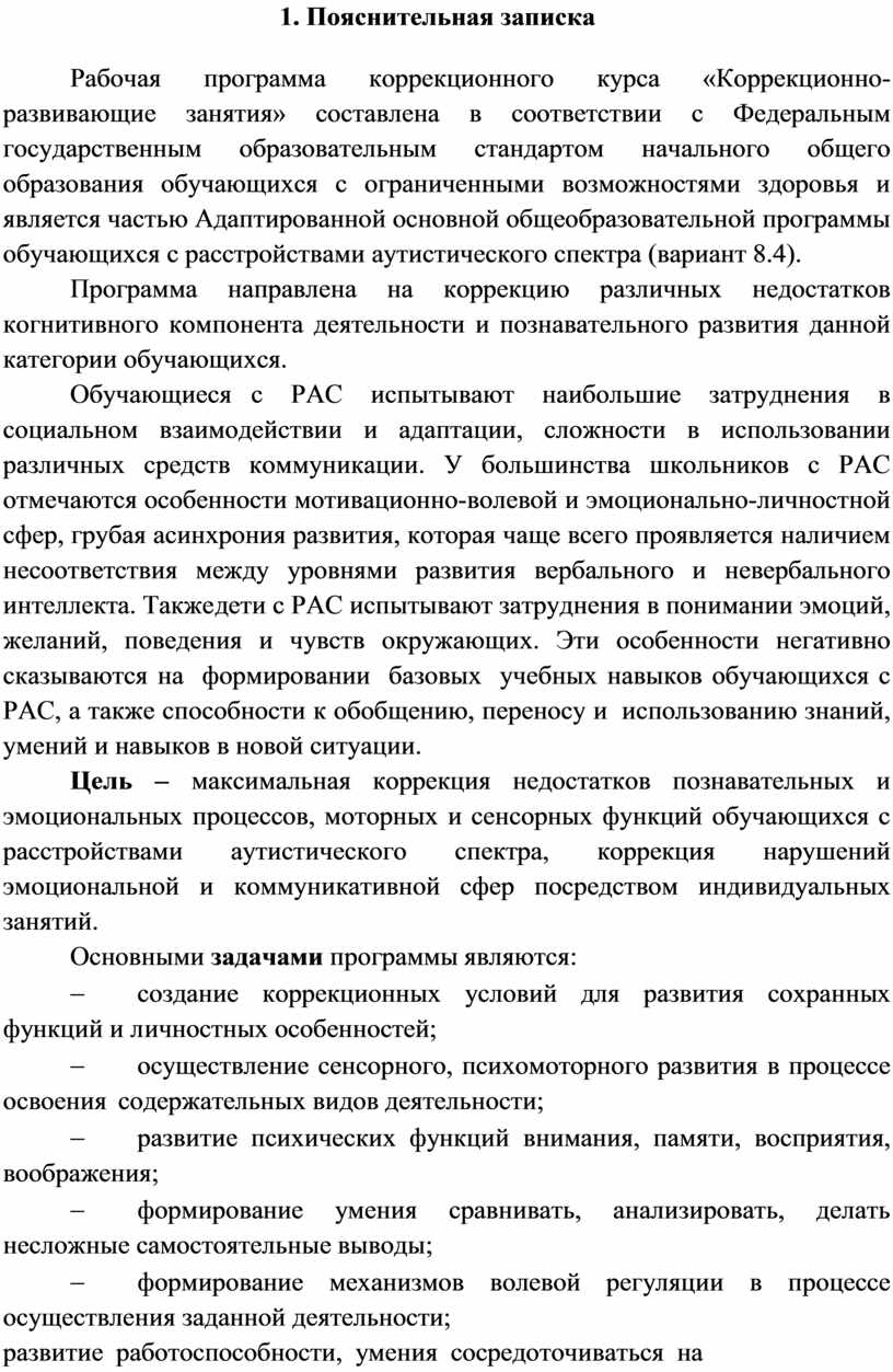 Рабочая программа коррекционного курса «Коррекционно-развивающие занятия» составлена в соответствии с Федеральным государственным образовательным стандартом начального общего образования обучающихся с ограниченными возможностями здоровья и является частью Адаптированной основной общеобразовательной программы обучающихся с расстройствами аутистического спектра (вариант 8.4).