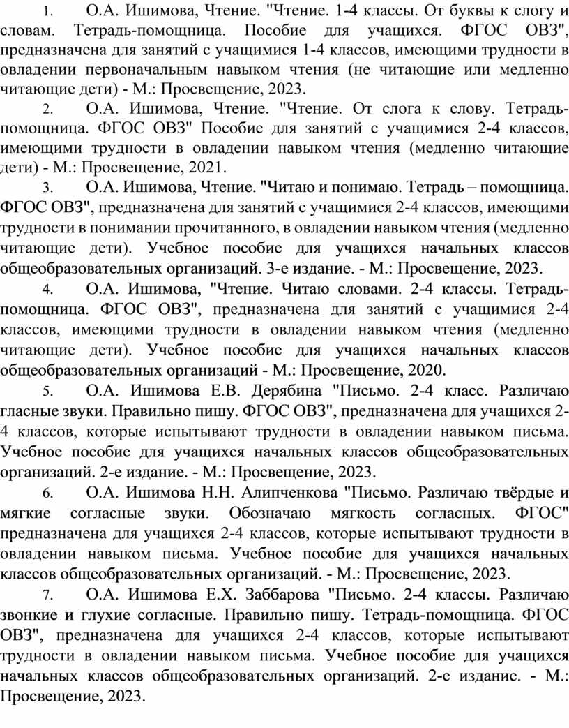 1. О.А. Ишимова, А.А. Алмазова. Развитие речи. Письмо. Тетрадь – помощница. "Адаптированные программы. ФГОС ОВЗ". входит в учебно-методический комплекс "Логопедическое сопровождение учащихся начальных классов". Пособие для учащихся начальных классов общеобразовательных организаций. - М.: Просвещение, 2023