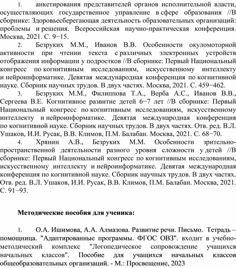 20. Безруких М.М., Иванов В.В. Особенности окуломоторной активности при чтении текста с различных электронных устройств отображения информации у подростков //В сборнике: Первый Национальный конгресс по когнитивным исследованиям, искусственному интеллекту и нейроинформатике. Девятая международная конференция по когнитивной науке. Сборник научных трудов. В двух частях. Москва, 2021. С. 459−462.