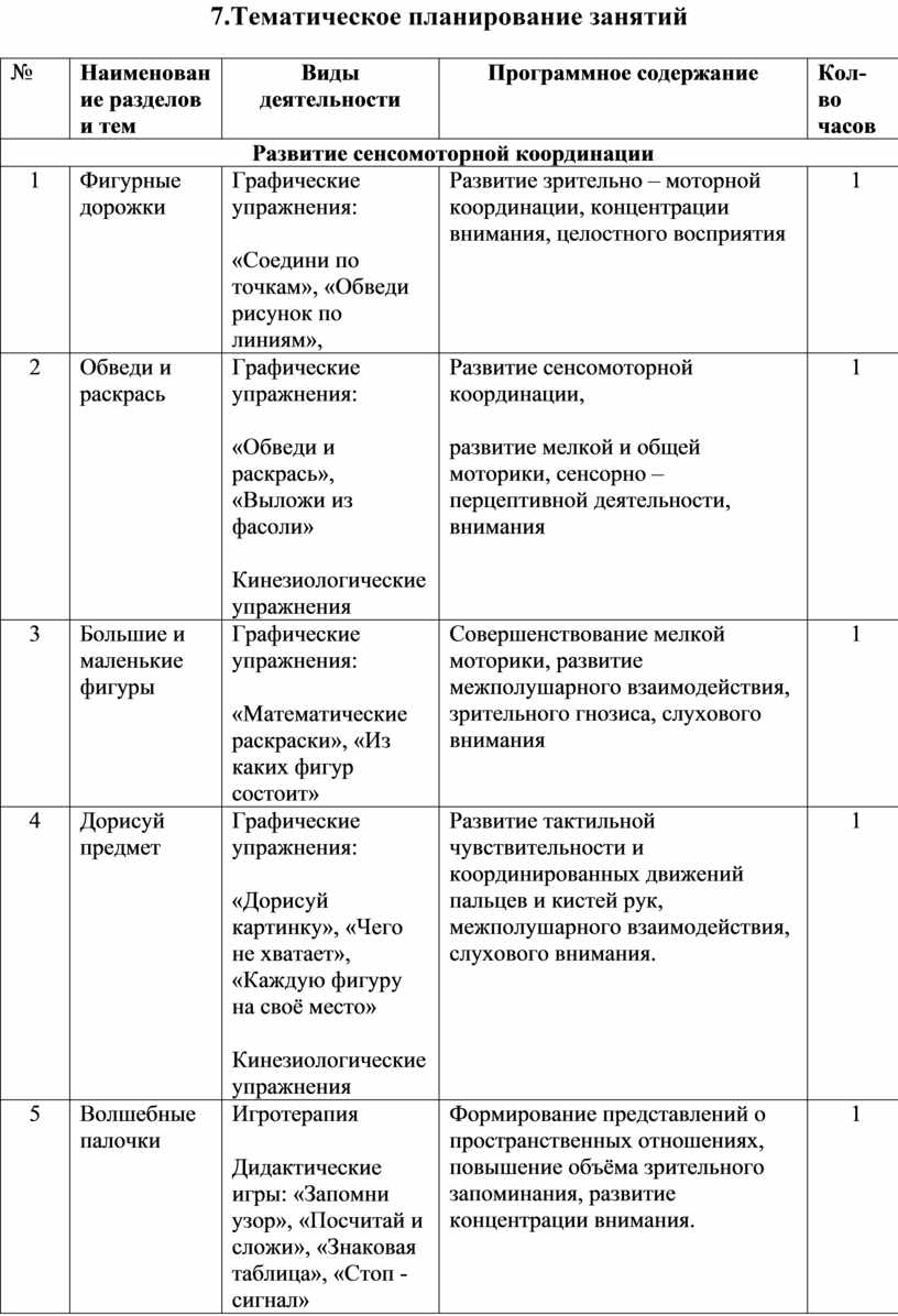 В программу включены мероприятия, способствующие формированию способности эстетически воспринимать окружающий мир во всем многообразии свойств и признаков его объектов (цветов, вкусов, запахов, звуков, ритмов); включены задачи совершенствования координации движений, преодоления моторной неловкости, скованности движений, развития мелкой моторики руки и др.