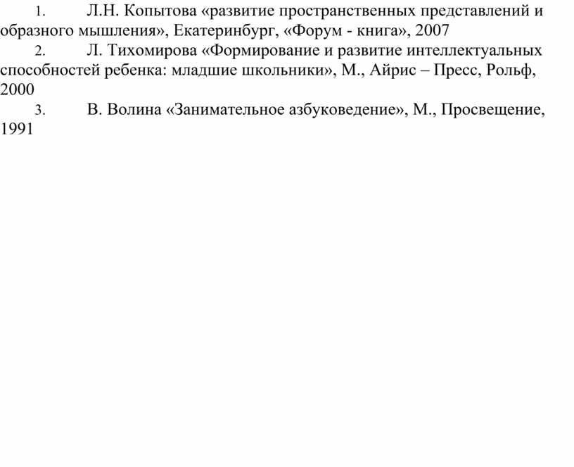 23. Л.Н. Копытова «развитие пространственных представлений и образного мышления», Екатеринбург, «Форум - книга», 2007