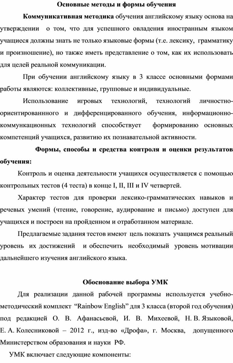 Для реализации данной рабочей программы используется учебно-методический комплект “Rainbow English” для 3 класса (второй год обучения) под редакцией О. В. Афанасьевой, И. В. Михеевой, Н. В. Языковой, Е. А. Колесниковой – 2012 г., изд-во «Дрофа», г. Москва, допущенного Министерством образования и науки РФ.