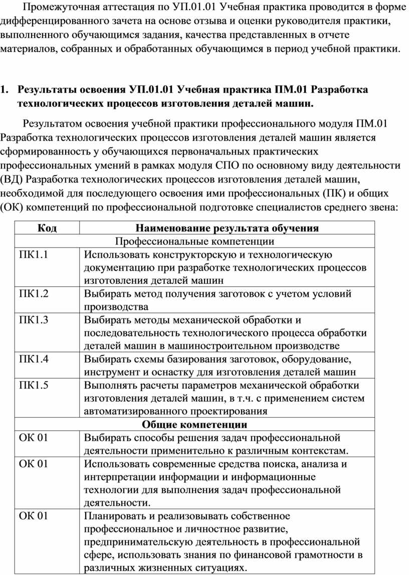 Результаты освоения УП. 01 Учебная практика профессионального модуля ПМ.01 Разработка технологических процессов изготовления деталей машин |