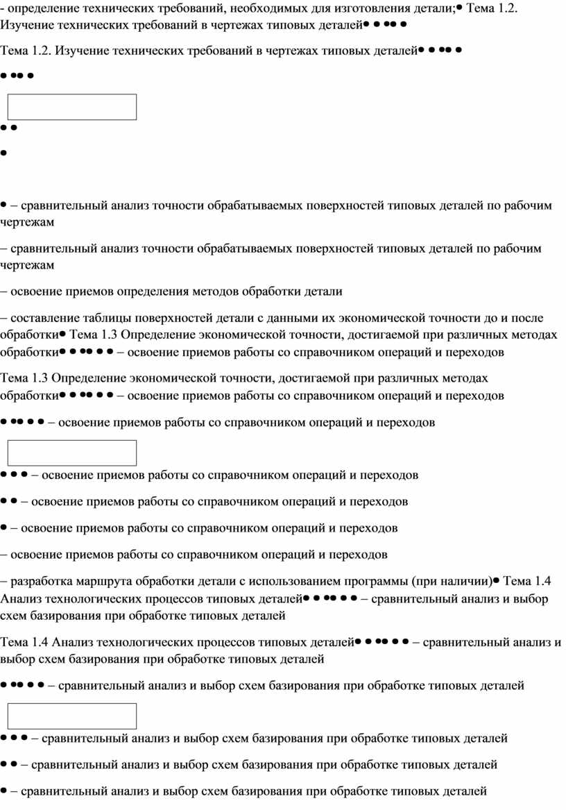 Содержание учебного материала: 1. Ознакомление с техническими требованиями рабочих чертежей типовых деталей 2. Освоение приемов определения технических требований для деталей тел вращения и сложной формы 3. Определение технических требований, необходимых для изготовления детали |