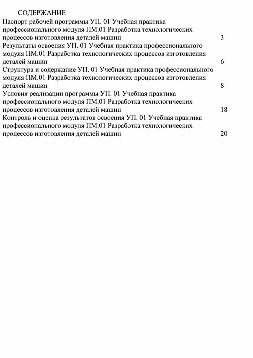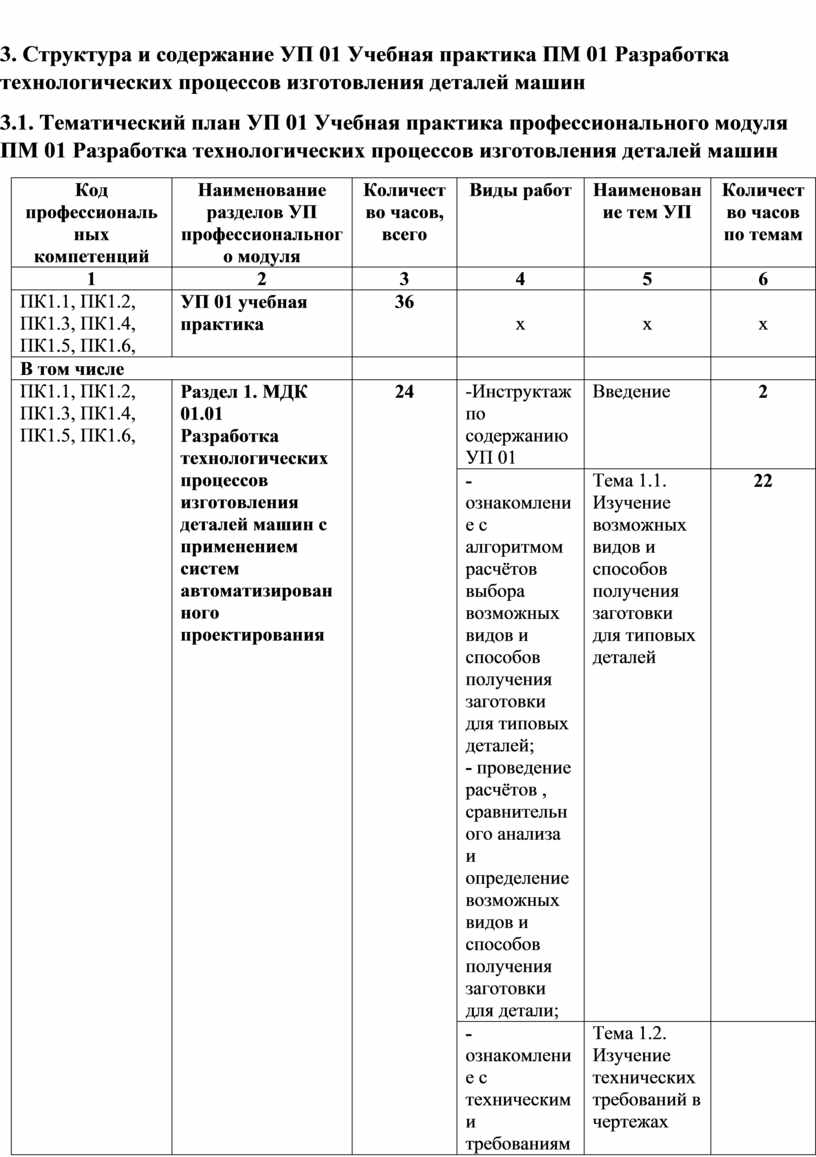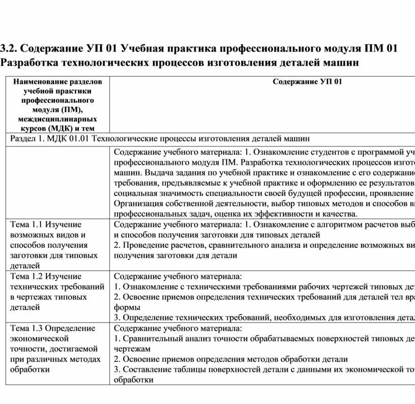 3.2. Содержание УП 01 Учебная практика профессионального модуля ПМ 01 Разработка технологических процессов изготовления деталей машин