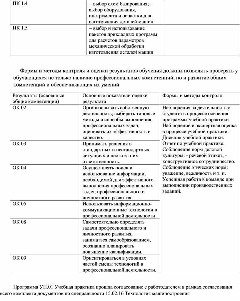 Программа УП.01 Учебная практика прошла согласование с работодателем в рамках согласования всего комплекта документов по специальности 15.02.16 Технология машиностроения