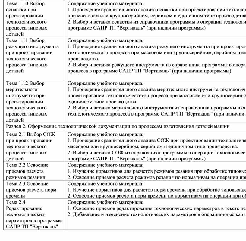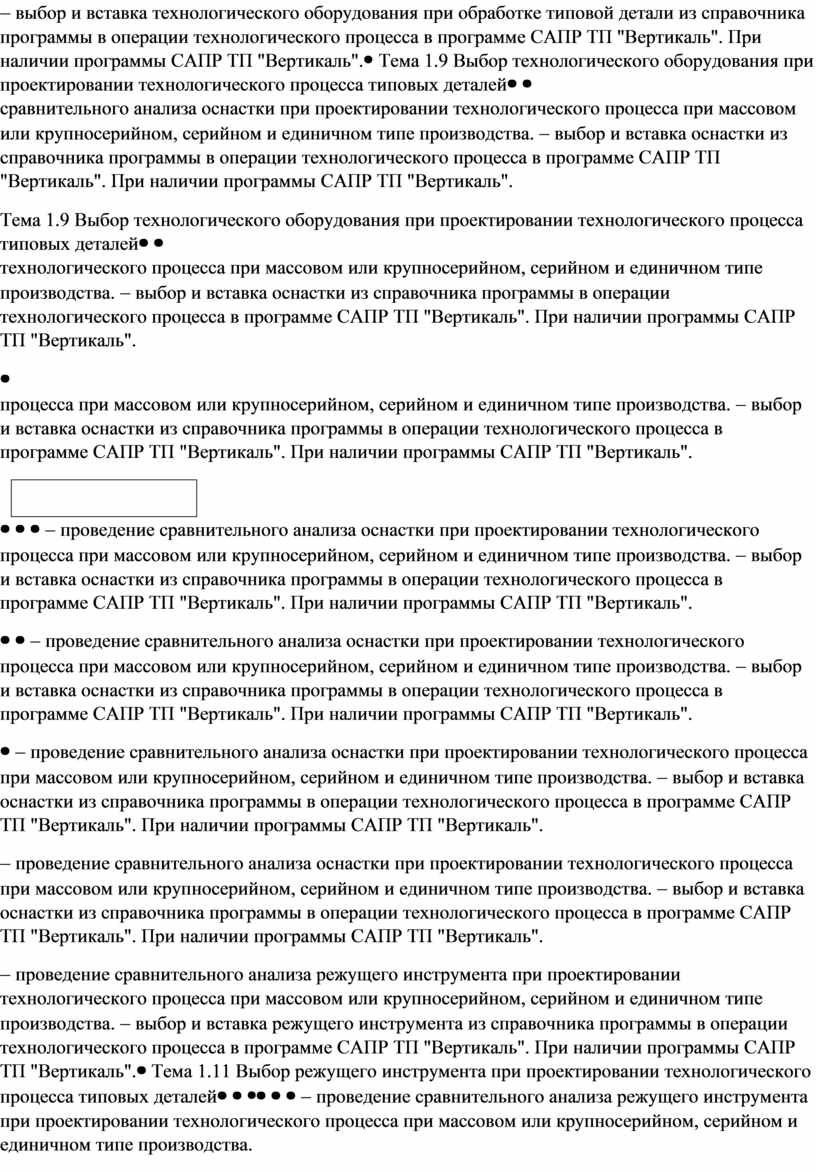 Содержание учебного материала: 1. Проведение сравнительного анализа технологического оборудования при проектировании технологического процесса при массовом или крупносерийном, серийном и единичном типе производства. 2. Выбор и вставка технологического оборудования при обработке типовой детали из справочника программы в операции технологического процесса в программе САПР ТП "Вертикаль" (при наличии программы) |