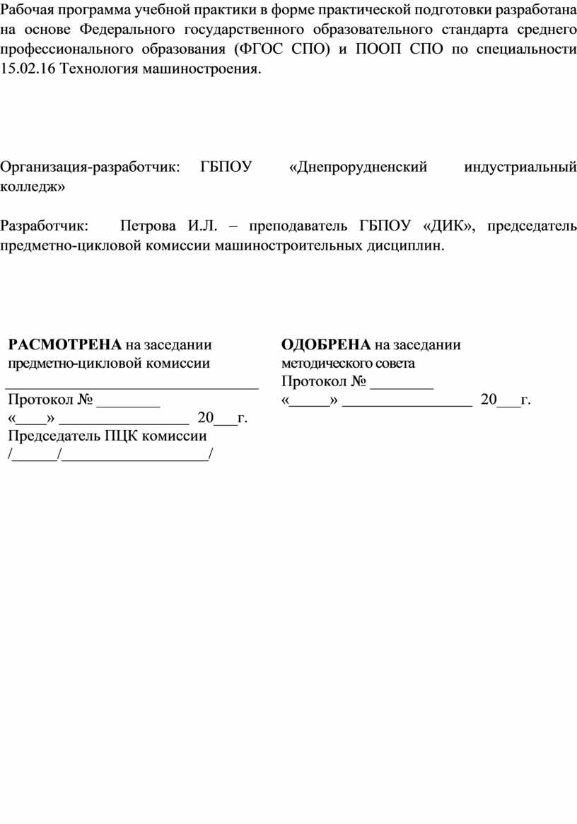 Организация-разработчик: ГБПОУ «Днепрорудненский индустриальный колледж»