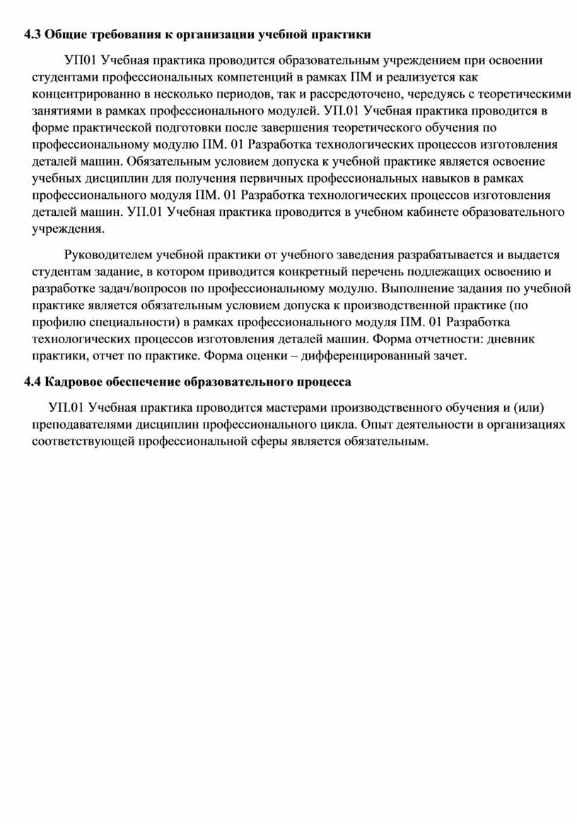 УП01 Учебная практика проводится образовательным учреждением при освоении студентами профессиональных компетенций в рамках ПМ и реализуется как концентрированно в несколько периодов, так и рассредоточено, чередуясь с теоретическими занятиями в рамках профессионального модулей. УП.01 Учебная практика проводится в форме практической подготовки после завершения теоретического обучения по профессиональному модулю ПМ. 01 Разработка технологических процессов изготовления деталей машин. Обязательным условием допуска к учебной практике является освоение учебных дисциплин для получения первичных профессиональных навыков в рамках профессионального модуля ПМ. 01 Разработка технологических процессов изготовления деталей машин. УП.01 Учебная практика проводится в учебном кабинете образовательного учреждения.