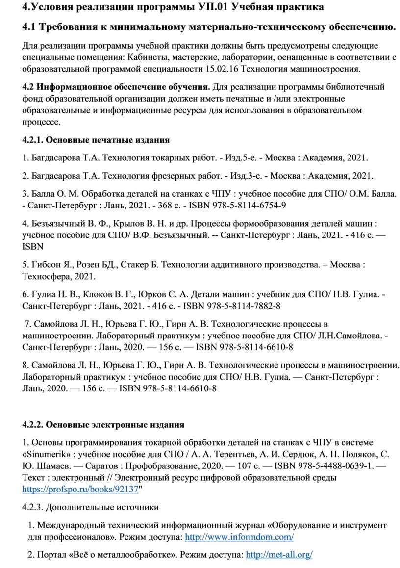 Рабочая программа учебной практики в форме практической подготовки разработана на основе Федерального государственного образовательного стандарта среднего профессионального образования (ФГОС СПО) и ПООП СПО по специальности 15.02.16 Технология машиностроения.