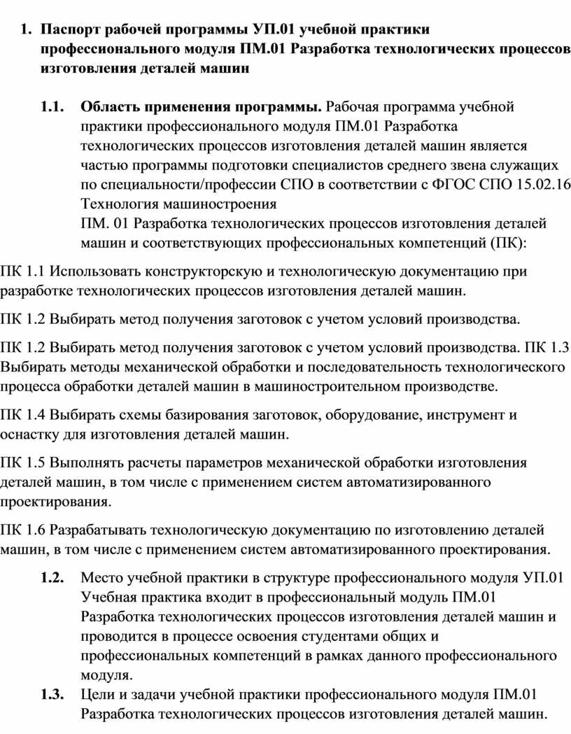 1. Паспорт рабочей программы УП.01 учебной практики профессионального модуля ПМ.01 Разработка технологических процессов изготовления деталей машин