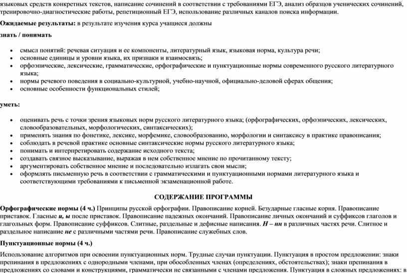 Орфографические нормы (4 ч.) Принципы русской орфографии. Правописание корней. Безударные гласные корня. Правописание приставок. Гласные и, ы после приставок. Правописание падежных окончаний. Правописание личных окончаний и суффиксов глаголов и глагольных форм. Правописание суффиксов. Слитные, раздельные и дефисные написания. Н – нн в различных частях речи. Слитное и раздельное написание не с различными частями речи. Правописание служебных слов.